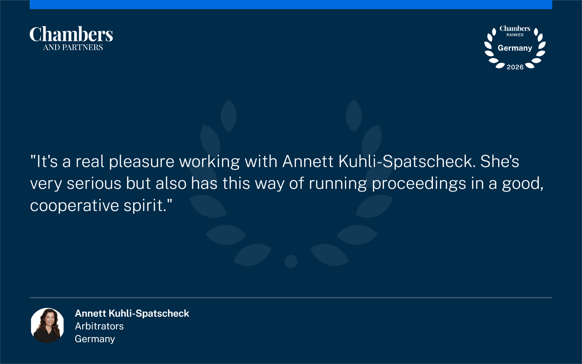 Auch weltweit empfiehlt uns Chambers Global 2026 im Bereich Arbitration sowie Dr. Annett Kuhli-Spatscheck auf internationaler Ebene als Schiedsrichterin.
